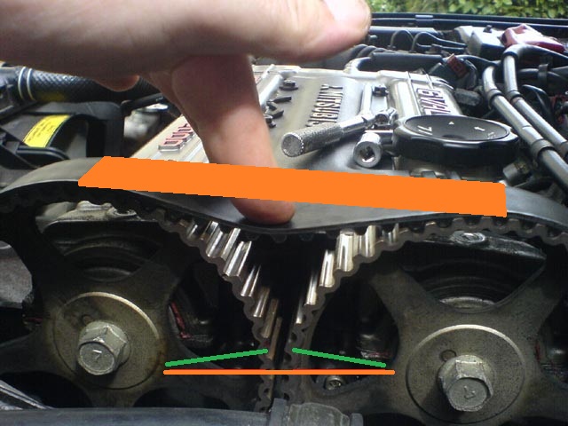 das bild ist nicht von mir! Mein Zahnriemen ist straff, so wie er sein soll. Nach der orangen Linie haben wir ihn zuerst eingestellt (so wies halt sein soll. Mit der einstellung lieg er allerdings nicht richtig, ich kam mir vor wie in nem 45 Ps Polo. Dann haben wirs so gemacht wie die grünen Linien stehen, und er fährt sich wieder einwandfrei.