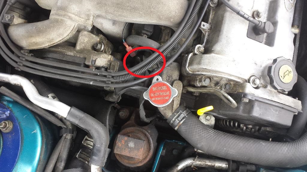 Davorstehend oben links am Motor, neben der Ansaugbrücke, am oberen Kühlerdeckel