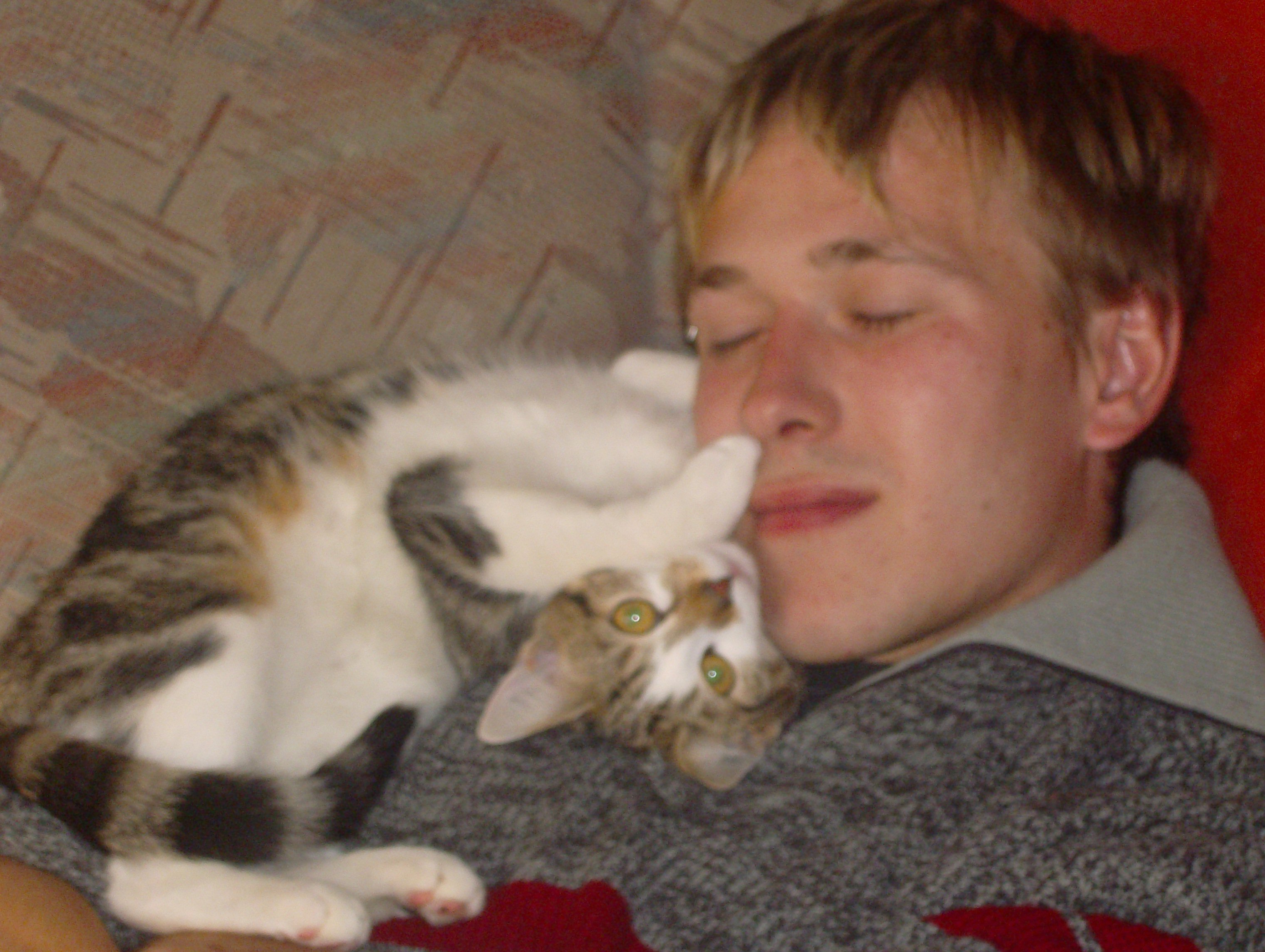 Ist Schwarz, Grau, Weiß getiegert und ist eine Katze Names Fussel.
