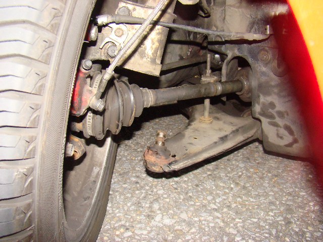 Oha , das sieht böse aus, Da hat sich die Sicherrungsschraube vom Federbein verabschiedet, Das Traggeleng vom Querlenker wird unten in deas Federbein reingesteckt und da wo jetzt die Schraube fehlt kommt ne neue Rein ,Mutter drauf ,hält.Die Antriebswelle ist aus dem Getriebe rausgerutscht, muß halt wieder rein