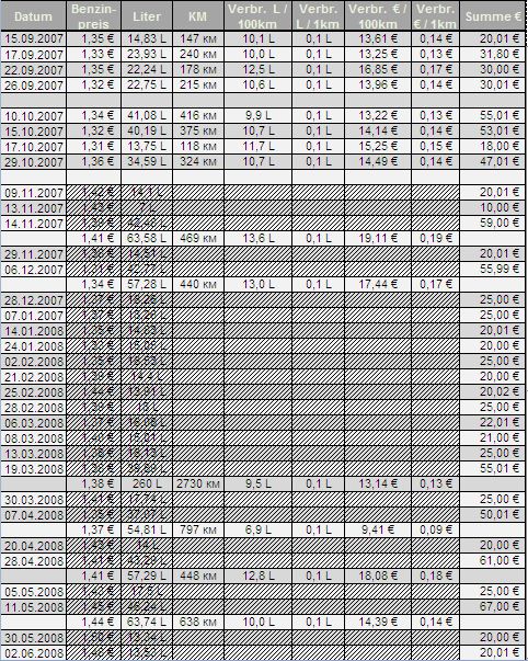 Zum Thema Verbrauch kann ich einiges sagen, das Auto ist extrem davon abhängig wie man mit dem Turbo umgeht. Hier habt ihr einen kompletten Auszug aus meiner privaten Buchhaltung bezüglich Sprittverbrauch seitdem ich mein Auto habe. :achso: (euros nicht zusammenzählen...euros nicht zusammenzählen...euros nicht zusammenzählen... :achso: )