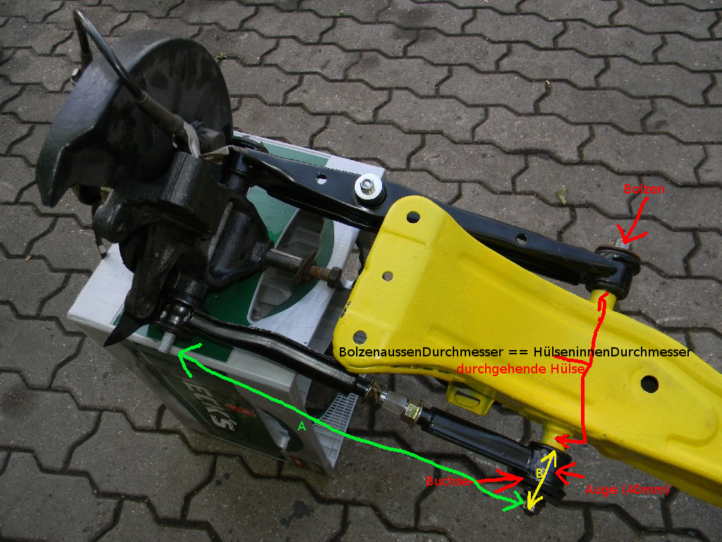 Veränderung im Fahrverhalten gut und schön, aber dann können nur die "Stummel" die hinten noch vom Bolzen rausragen (ca. 50mm Buchsenbreite + 25mm Gewinde) stabilisiert werden.