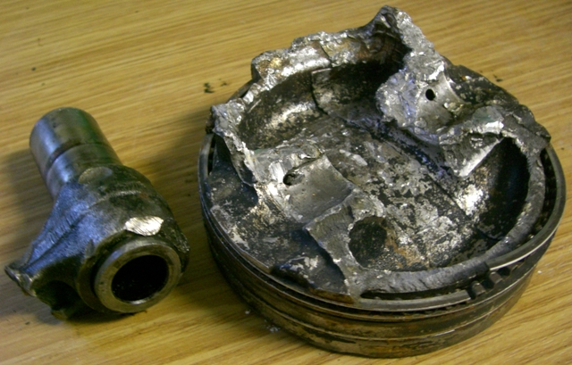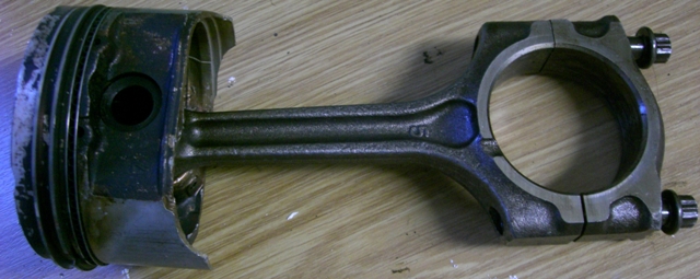 Auf Anfrage mal ein paar Bilder von einem Kolben samt Pleuel von allen Seiten, einem kaputten Pleuel und einem Stück Motor.