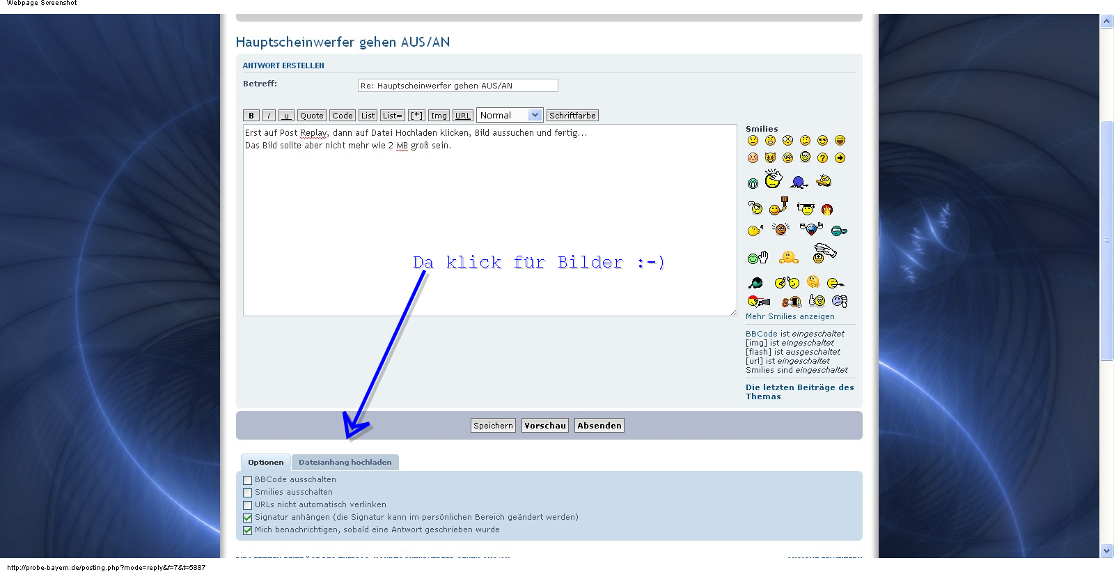 Erst auf Post Replay, dann auf Datei Hochladen klicken, Bild aussuchen und fertig...