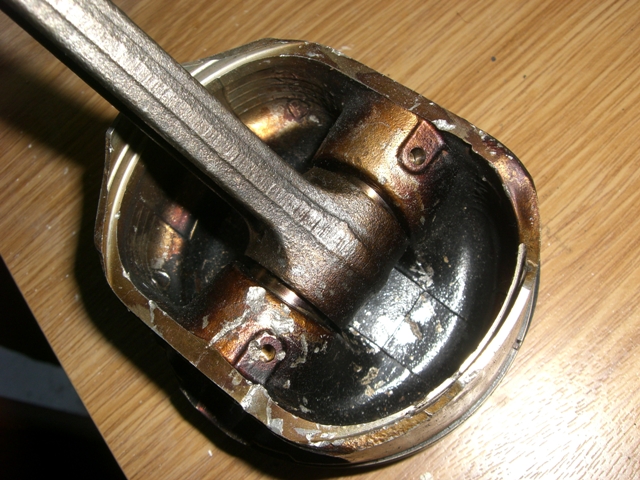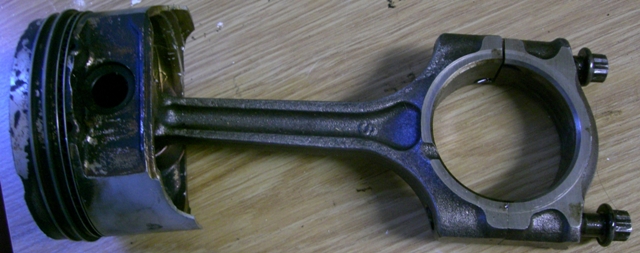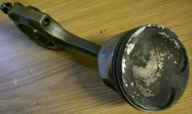 Auf Anfrage mal ein paar Bilder von einem Kolben samt Pleuel von allen Seiten, einem kaputten Pleuel und einem Stück Motor.